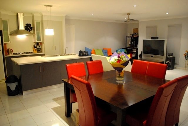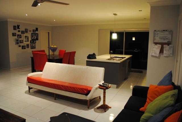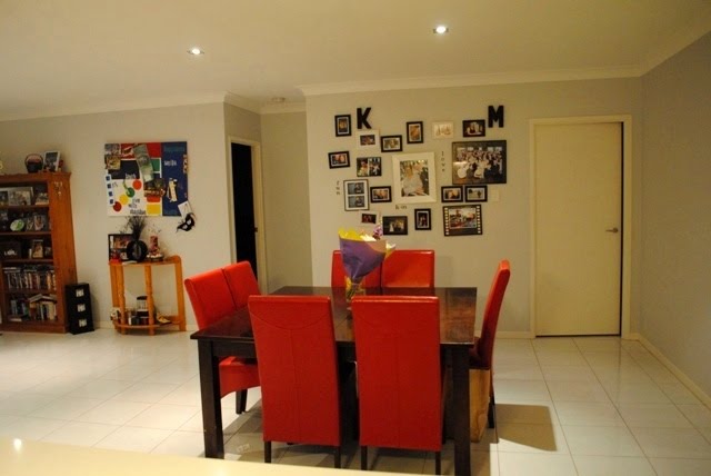 Put the TV where the blue couch is, set the blue couch directly opposite it, define that area with a rug to tie it together. In that last picture, the photos on the wall need a little rearranging. Take that big black frame on the right hand side and move it up where the M and the two smaller ones are, put those two little ones one under the other where the black one was with the M to the right. Tie it all together with a narrow hall table and a lamp on the left hand side of it,(the table),a wide shallow bowl maybe in silver? on the right side, another area rug under the dining suite. For that big sliding glass door, change the blind to a colour that ties in with both areas. Change the orange couch seat to blue (dye it?) and put orange scatter cushions, with maybe one or two blue ones as well. Or that semi circular table on the left would look good under the photo arrangement, but with nothing on top of it. Colour on the living room walls, with a warmer shade of the same colour in the dining area.