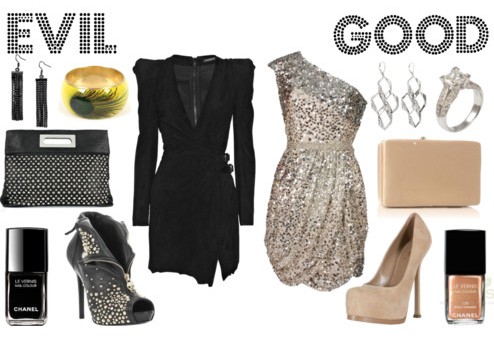So for my nice look I picked a nude glittery mini. Accessorised with nude shoes, bag and nail polish and finished off with a bit of bling. Light, feminine and a little bit over the top. Now on the evil side. Studded leather, black polish, glo-mesh earrings and a bit of colour in the form of this, can I get it right now, peacock feather print bangle. And don’t you think the structured shoulders of this dress are just so… dark side!?