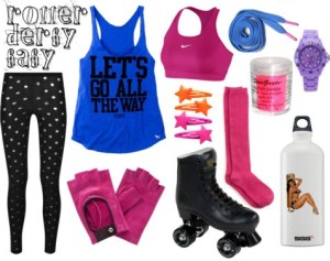 When Danimezza set this week’s challenge I knew exactly the look I wanted. Roller Derby cool. And let’s face it. I don’t actually know much about what that looks like in real life {and I doubt it includes a sports bra, I’m thinking more a sexy demi cup bra or something}. And these looked like racing type skates to me. Lots of glitter and bright colours and that shirt that is a little bit naughty.