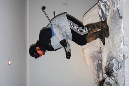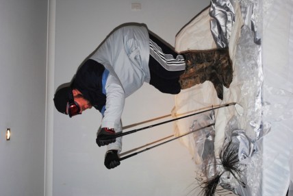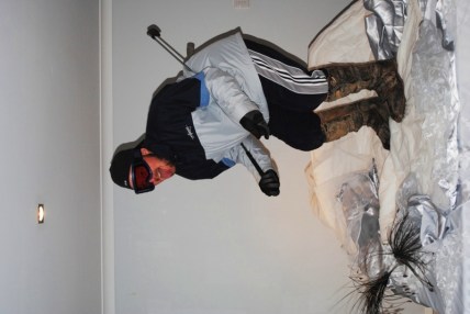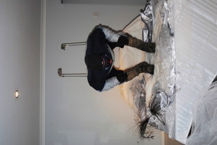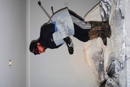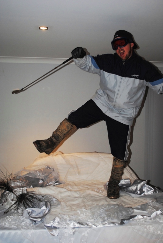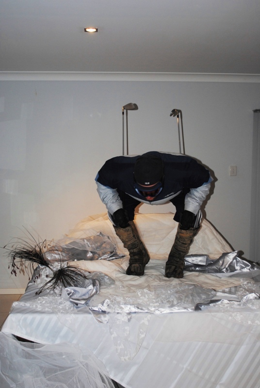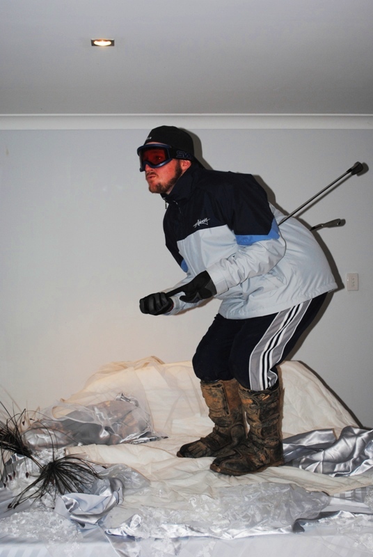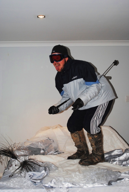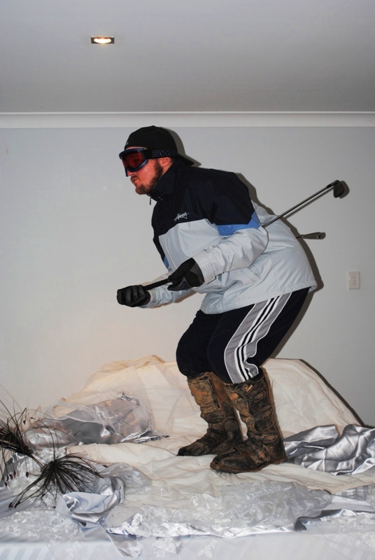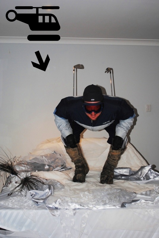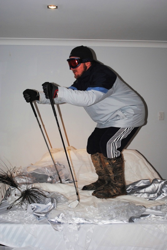 So what did you think of my first attempt of set design and styling? Those are the rements of the fabric of my wedding dress, a doona and a shower curtain all artfully placed on the dining table. Hubby is wearing his snow jacket, trackies, dirt biking boots, ski goggles and gloves. the helicopter was not actually there. Try and hide your disappointment.