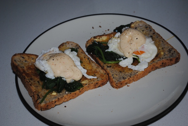 | Poached eggs, wholegrain toast, spinach leaves and chilli and lime mayo. Breakfast of champions. |
