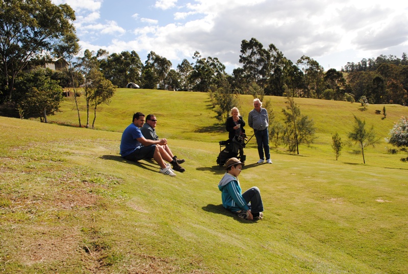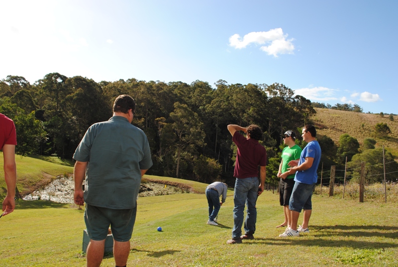 | The final foursome {the relatives} that ended up a group of 12 tees off. |