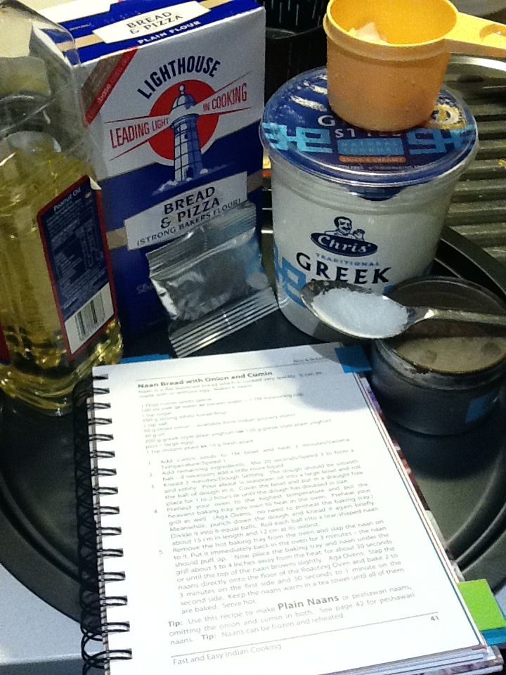 I was a bit afraid of making this. I worried that my fan forced oven wouldn’t be up to the required heat level that it takes to get the Naan to puff up and cook quickly. Well, turns out, at full heat it was. Again from the Thermomix Indian cook book. The ingredients are above. It was simple really. The dough is oily and kinda squishy, FYI. For those playing at home.